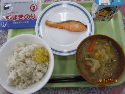 むぎごはん きざみたくあん ぐだくさんみそしる しゃけ てまきのり 牛乳・・・今日は、6年生のリクエスト給食No1のメニューでした。この献立は、今年度、「戦時中の食事」として給食で出されたものです。この戦時中の食事が6年生の心に残り、リクエストNo1になったのです。