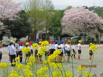 今日は、5年生が、春いっぱいの校庭で、体育をしていました。50メートル走です。桜の木の下での集合写真もよく撮れていました。