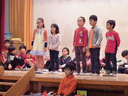 次は、2年生の「スイミーと2年1組のなかまたち」の劇でした。その中で、自分の得意なことを発表するなど楽しい出し物になりました。スイミーと赤い魚たちや海の中にいる生き物たちが、色とりどりにとてもよくできていて、雰囲気が盛り上がりました。