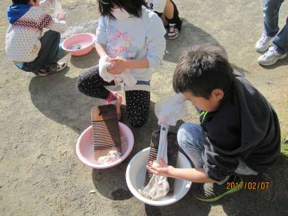 3年生は、洗濯板を使っての洗濯に挑戦しました。初めての経験、どうだったかな。