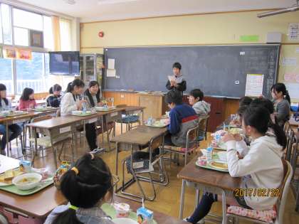 どの教室でも6年生を囲んで、楽しそうに給食を食べる姿が見られました。1年間いろいろな面でかかわってきた6年生とのお別れは寂しいですが、この給食も一つのよい思い出になったことでしょう。