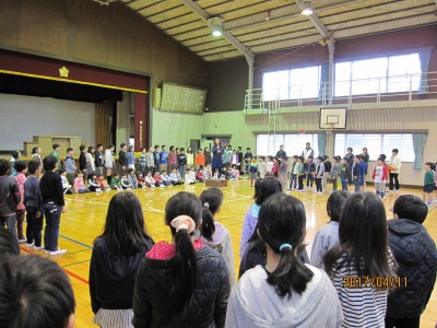 4月11日。「ようこそ1年生朝会」が行われました。6年生が手をつないで入場しました。1年生は、自分の名前を大きな声で言うことができました。2年生〜6年生は「小さな勇気」の歌を1年生にプレゼントしました。そして1年生と一緒にジェンカで遊びました。これからもたくさん一緒に遊びましょう。