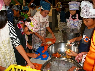 足柄ふれあいの村に着き、お弁当を食べた後、グループで村内散策を行いました。そしていよいよ野外炊事カレー作りの始まりです。子どもたちは、それぞれの役割で動き始めました。写真は野菜を切る係です。
