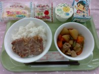 今日の給食は、第4位の焼き魚と同票の「からあげ」の献立です。大きなからあげに大満足です。麦ご飯と具だくさん味噌汁といただきました。