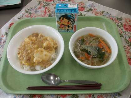 マーボーどうふどん(むぎごはん) ビーフンスープ 牛乳・・・今日のマーボーどうふどんは、いつもと少し違って、ピリッとからくちでした。暑い時期にピッタリの味に子どもたちもたくさん食べていました。おいしかったです。