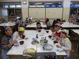 5年生は家庭科の学習でご飯と味噌汁を作りました。出汁は鰹節でとりました。透明のガラス鍋でご飯を炊きました。どんな風にご飯が炊けるのかみんなのぞき込んでいました。おいしいご飯が炊きあがって大喜びです。