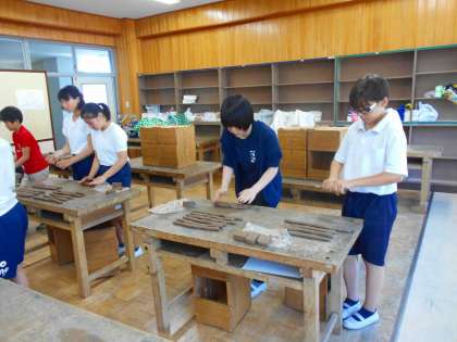 6月26日(水)1・2時間目に外部講師の相原さんを招いて土器作りをしました。説明をしていただいた後に子どもたちは一人ひとり自分の思いをこめて土器を作りました。ここから2週間ほど乾燥させた後、相原さんが素焼きにしてくれます。今からできあがりが楽しみです。
