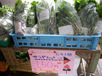 この早川いきいきフエステイバルで、「自分たちで育てた野菜を売ろう」という目標を立てて夏休み前から取り組んできた6年生。PTA会長さんの畑を借りて、耕しから種まき、草取り、収穫まで子どもたちが関わってきました。そして今日、午前中に収穫してきた新鮮な野菜の中から、一人ひとりが野菜をえらび、「サラダセット」を作り、自分で書いたラベルを貼って準備完了。ハロウインの仮装をして売り始めました。サラダセットは好評で、次々と売れ、完売しました。売り上げは、5,800円。すごいですね。