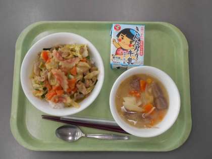 今日の給食はぶた肉のスタミナ丼(麦ご飯)、もやしの味噌汁、牛乳でした。
