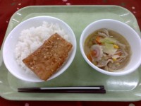 今日の給食は麦ご飯、かまぼこフライ、根菜の味噌汁、牛乳でした。