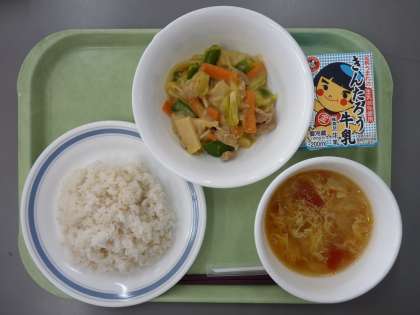 今日の給食は麦ご飯、回鍋肉、卵とトマトのスープ、牛乳でした。