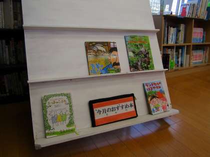 図書室のカウンターは、本の返却や貸し出しで大忙しの様子でした。入り口には、今月のおすすめ本が置かれています。おもしろそうですよ。
