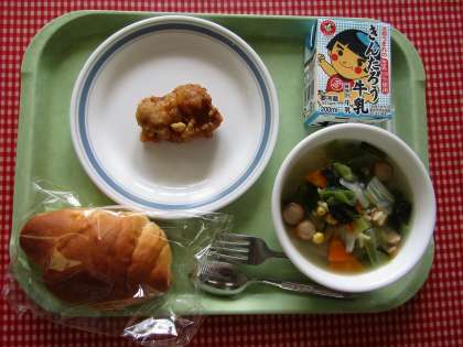 今日の献立【とりのから揚げ・ABCスープ・ロールパン・牛乳】