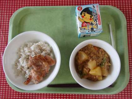 今日の献立【とり肉のレモンじょうゆ焼き・野菜のピリから煮・麦ご飯・牛乳】