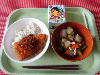 今日の献立【鰺(あじ)の南蛮漬け・冬瓜汁(とうがんじる)・麦ご飯・牛乳】