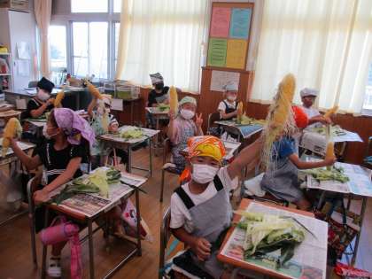 全校の給食用のトウモロコシの皮をバナナの皮のように1枚1枚はがしたり、たくさんついているひげを丁寧に取ったりしながら、楽しく活動しました。記念にトウモロコシのひげを持ち帰った子もいます。