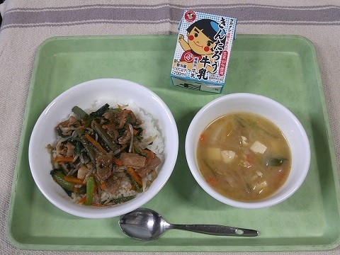 「今日のビビンバ丼には、リンゴソースが入っています。リンゴソースには、いろいろな栄養素が入っています。血圧を下げたり、むくみを改善したりします。また、食物繊維であるペクチンも豊富に含まれています。これらは、腸内環境を整え、体内でのコレステロールの吸収を抑える効果があります。ほかにも、カリウムも入っていてむくみに効くので、ぜひ、食べてみてください。」