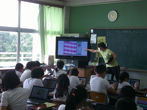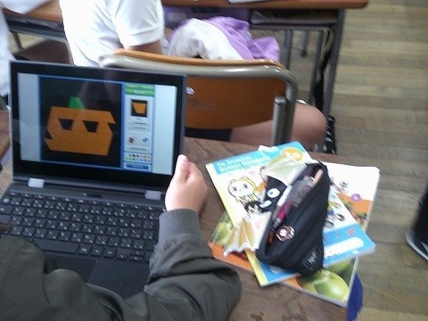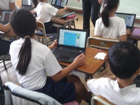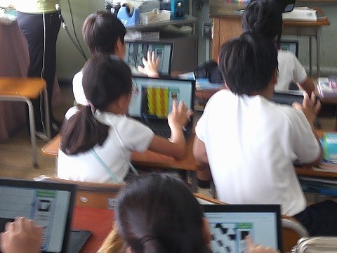 学習用端末を使って、平行四辺形をひっくり返したり、合わせたりしながら、辺の長さ、角の大きさなど図形のもつ性質について理解を深めていきます。また、子どもたちは、色付けや移動させながら図形のもつ美しさや不思議さを感じとることができていました。