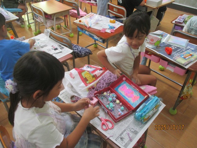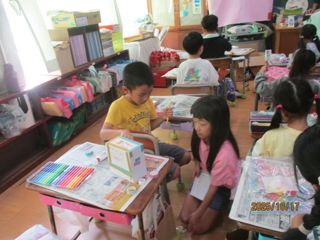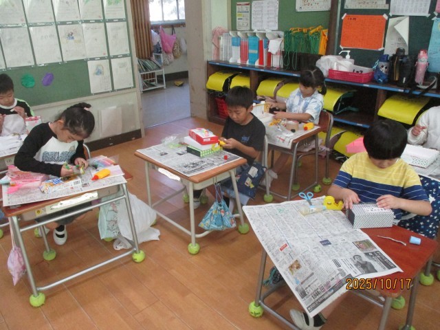 1年生は図工の学習で「たいせつボックス」という創作活動をしていました。お気に入りの箱を用意し、どんなものを飾ろうかなとわくわく。「大切なもの」を入れるための箱です。思いに合う形や色を見つけ、仕切りをつくっていました。中には、毛糸でじゅうたんを作ってフワフワの床にしたり、キラキラするものをたくさんつけたりして、宝石箱にしている子もいました。誰かのおうちかな?という子が多かったです。