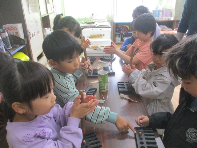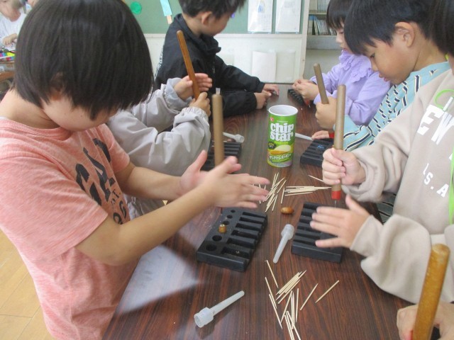 どんぐりに穴をあけ、つまようじを刺して、こまややじろべえを作っていました。