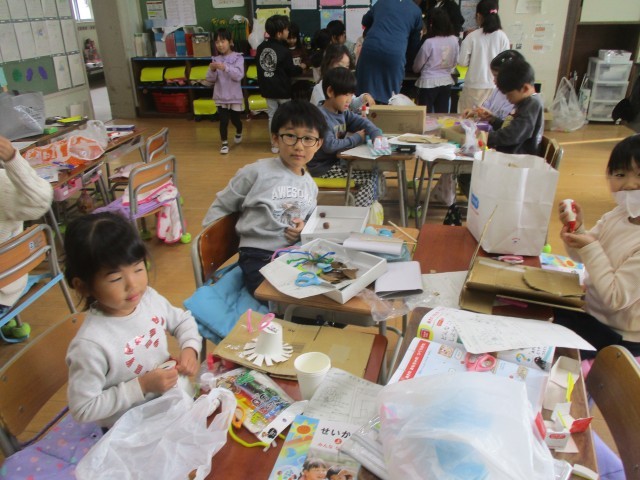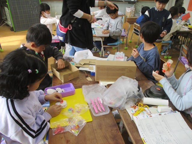 1年生は、先週の遠足で集めてきたどんぐりや落ち葉を使って、工作をしていました。