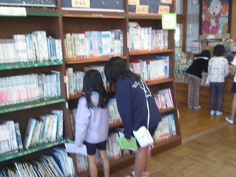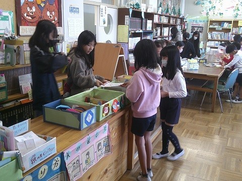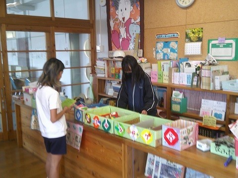 図書委員会の5・6年生は、低学年の子の本を一緒に探したり、カードへの書き方を教えたりと優しく声をかけて活動をしていました。