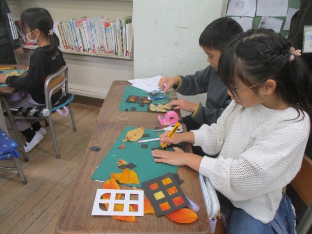 本校の周りは紅葉シーズンの真っただ中。赤や黄色のきれいな落ち葉がたくさんあります。それらを活用して黒い窓にあてはめて飾りを作りました。