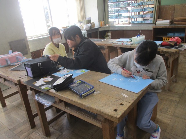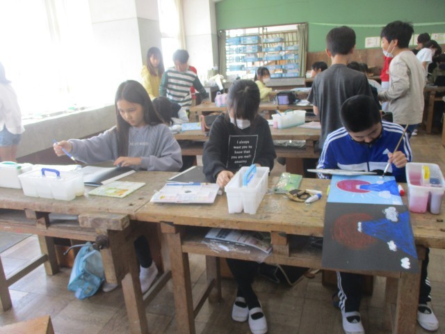 形や色の重なりを確かめて、版に表すときの感覚や行為を通して、動きや奥行き、バランス、色の鮮やさなを考えていました。
