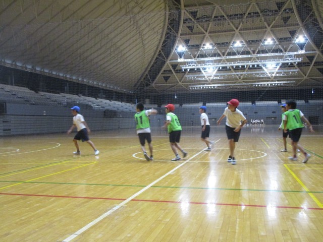 球技クラブでは、小田原アリーナを借りてハンドボールをしていました。大きな体育館に、きれいなゴール。奥では陸上クラブがシャトルラン。いつもよりよい記録が出そうです。