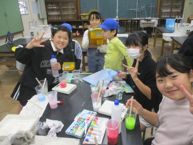 科学実験クラブでは、スライムをつくっていました。一人ひとりやわらかさに好みがあるようで、3年生も作りたいようでした。