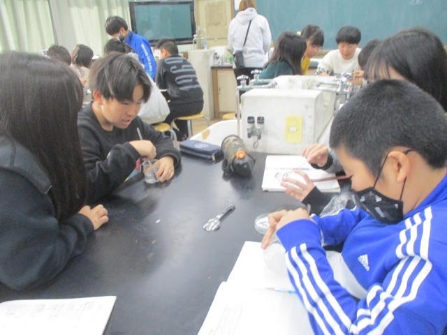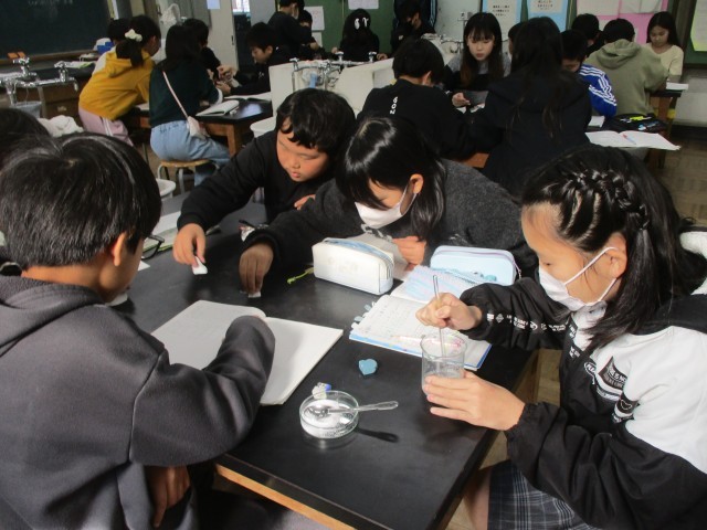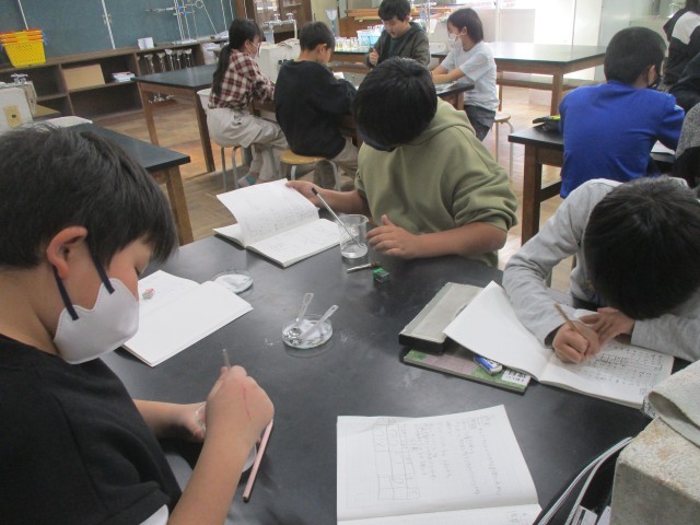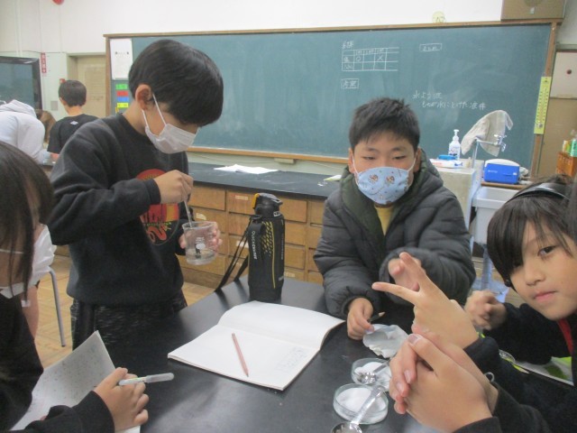 子どもたちは砂糖や食塩を水に溶かす経験はしているのですが、せいぜいスプーン1杯程度です。今日は、スプーン1杯ずつどこまで溶けるのかを調べていました。初めのうちは透明なのでわかりやすかったのですが、少しずつ濁りだし、溶け残りが出てくると終わりとします。同じようにミョウバンについても実験を行いました。