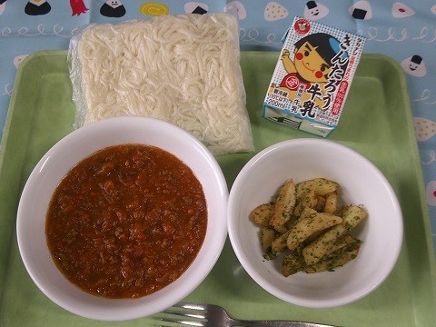 今日は、子どもたちの好きな給食アンケートで選ばれた献立でした。主食部門、第3位の‘ミートソーススパゲッティ’とおかず部門、1位の‘のり塩ポテト’です!