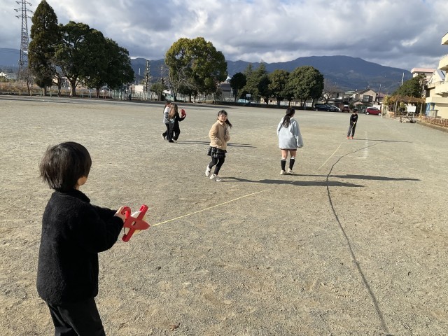 算数では、面積の学習を進めています。これまでは1㎝²という小さな単位をもとに、いくつ分あるかを考えてきましたが、新たに大きい単位である「1㎡」を学習しました。子どもたちは、1㎡の広さを知ると「こんなに広いの?」と驚いた様子でした。学習を進める中で「教室の広さってどれくらいなんだろう?測ってみたい!」「校庭や体育館はどうなんだろう?」疑問に思う声が聞こえてきたので、学習したことを生かして実際に面積を測ってみました。