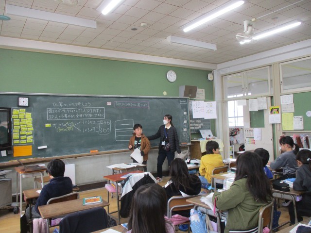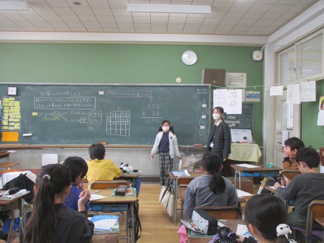 三年生は、算数「ひっ算のしかたを考えよう」で、大きい数のかけ算(2けた・3けた×2けた)を学習しています。