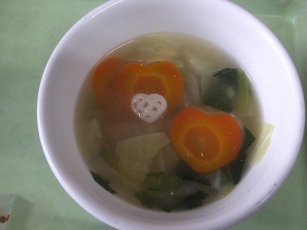 「今日のスープに入っているにんじんは、調理員さんがひとつひとつていねいにハート型に切ってくれました。愛情たっぷりに仕上げたので、よく味わって食べてください。」