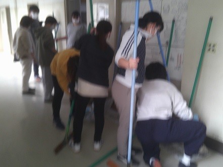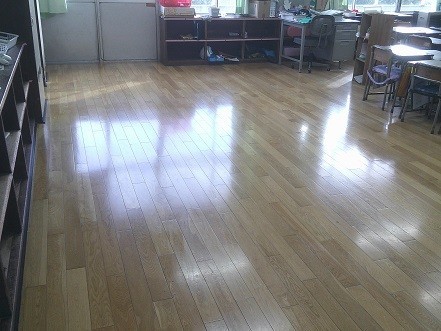 先週、今週、教室の床を半分ずつ職員が協力してワックスがけをしました。