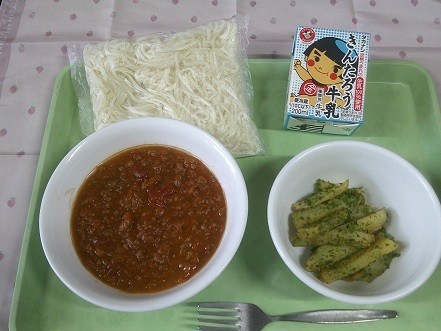 「今日もリクエスト給食です。今日のミートソーススパゲッティは、6年生の好きな給食めん部門の第2位でした。さらに、のり塩ポテトもおかず部門第1位でした。明日も楽しみですね。」