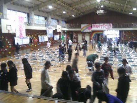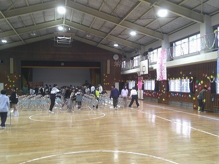 本校の体育館は、椅子が奈落、地下部分に収納されているため、出すのにも一苦労ですが、みんな協力しながら運び出していました。