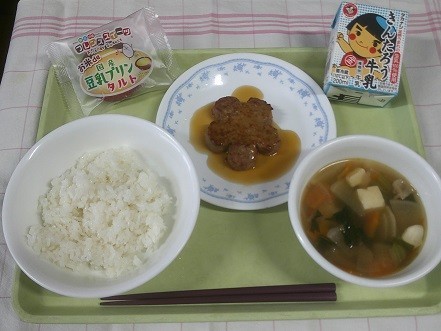 「今日の産地をお知らせします。牛乳・・・神奈川県、 小松菜・豆腐・・・小田原市、 こんにゃく・・・群馬県、
