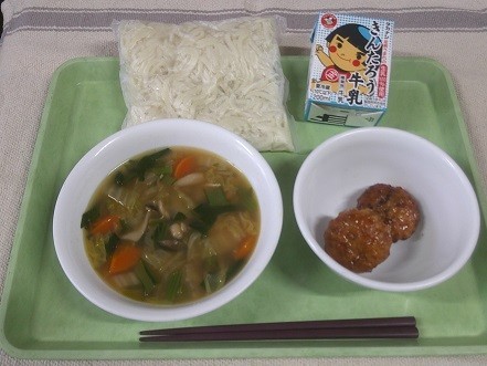 「今日の五目うどんに使われている小松菜には、カルシウムや鉄分などの栄養がたくさん入っています。苦手でも一口は食べてみてください。」