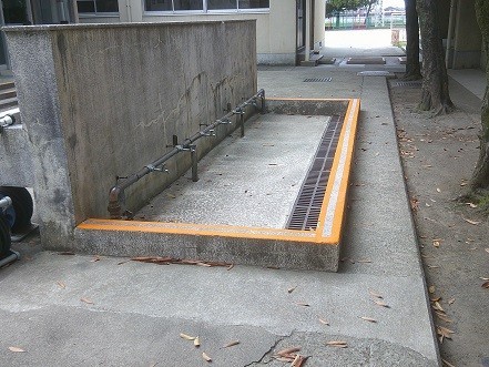 水飲み場、中庭に行く部分、校庭から昇降口や道路に行く部分など黄色い色をつけました。