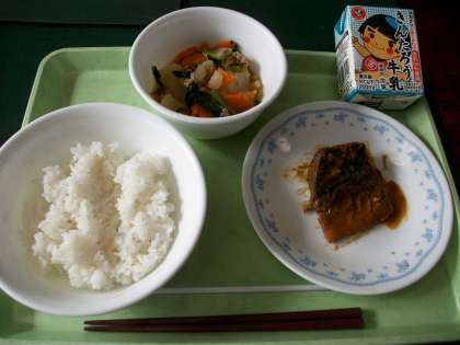 今日はさばのみそ煮がでていますね。今日は、さばについてお知らせします。さばは頭をよくしてくれます。なので、残さず食べましょう。骨もあるので、よくかんで食べましょう。