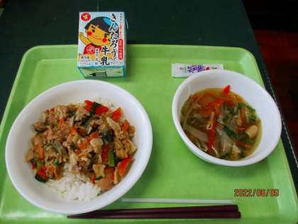 スタミナ丼・中華風スープ・牛乳・かみかみ昆布