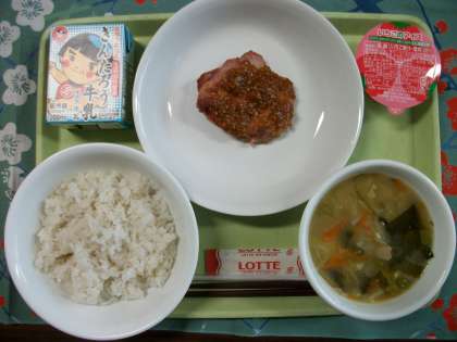 焼き肉のたれは、給食室で作ったイチオシのたれです。たまねぎ・にんじん・りんご・にんにく・しょうがをすって、調味料を加え作りました。味がしっかりしているので、ごはんも進みます。