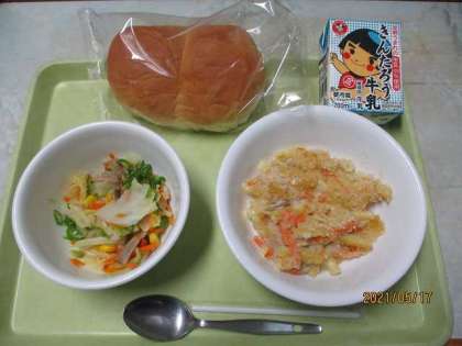マカロニグラタン・野菜ソテー・ソフトフランスパン・牛乳