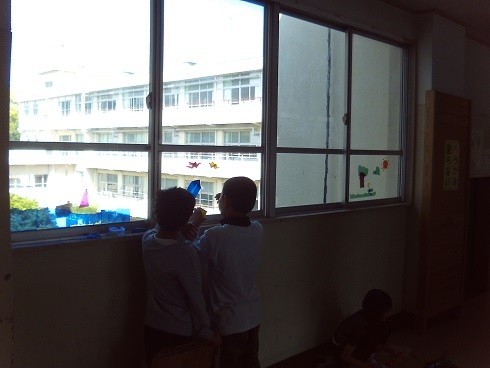 セロハンの光を透す性質を生かして、作品作りに取り組んでいた4年生。