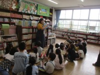 1年生は、学校司書の先生に本の借り方を教わっていました。たくさんの本に囲まれた図...