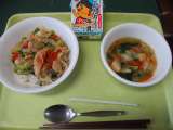 チキンライス・おほしさまスープ・プリンタルト・牛乳 ◇スープに入っていた小松...
