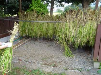 稲刈り用の鎌を使い一生懸命に稲を刈ったり、刈った稲を稲わらで結び干したりしました。