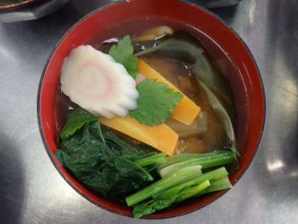 2年生最後の調理実習はお雑煮です。包丁にも慣れてきたようで、ピーラーを使わずにダイコンやニンジンの皮をむき、薄く短冊に切りました。最近は便利な粉末出汁調味料がありますが、素材本来の美味しさを知ってもらいたいので、昆布と鰹節から出汁を取ることにも挑戦しました。短い時間の中で、4つの分担に分かれ、最後に合わさって完成を目指す実習です。チームの協力が問われる実習でしたが、先生方もご馳走になり、完成したお雑煮に舌鼓を打ちながら、一足早くお正月の雰囲気を味わいました。